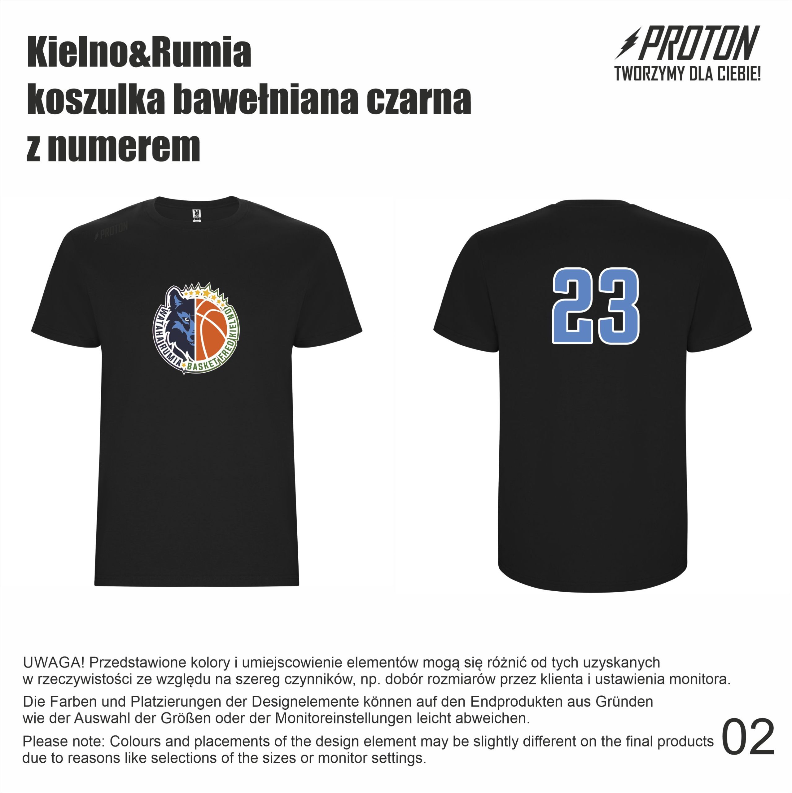 Czarna, bawełniana koszulka z nadrukiem logo Kielno&Rumia na przodzie i numerem na tyle koszulki.